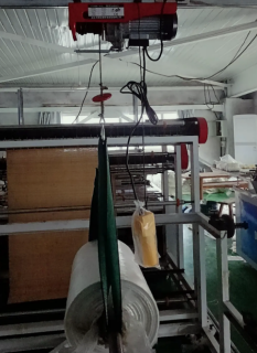 微型電動葫蘆是一種小型的重物吊裝設備,能夠滿足大卷塑料袋的承重要求,位于車床設備旁邊的工人員能夠借助電動葫蘆的遙控器控制電動葫蘆的升降和左右移動,在節省人力的情況下輕松、快速完成大卷塑料袋的轉移任務。